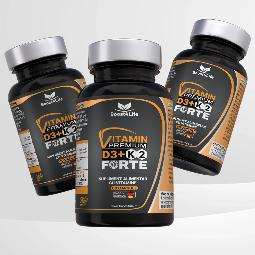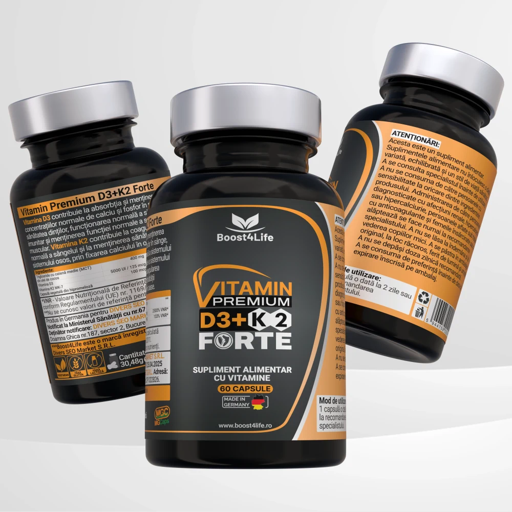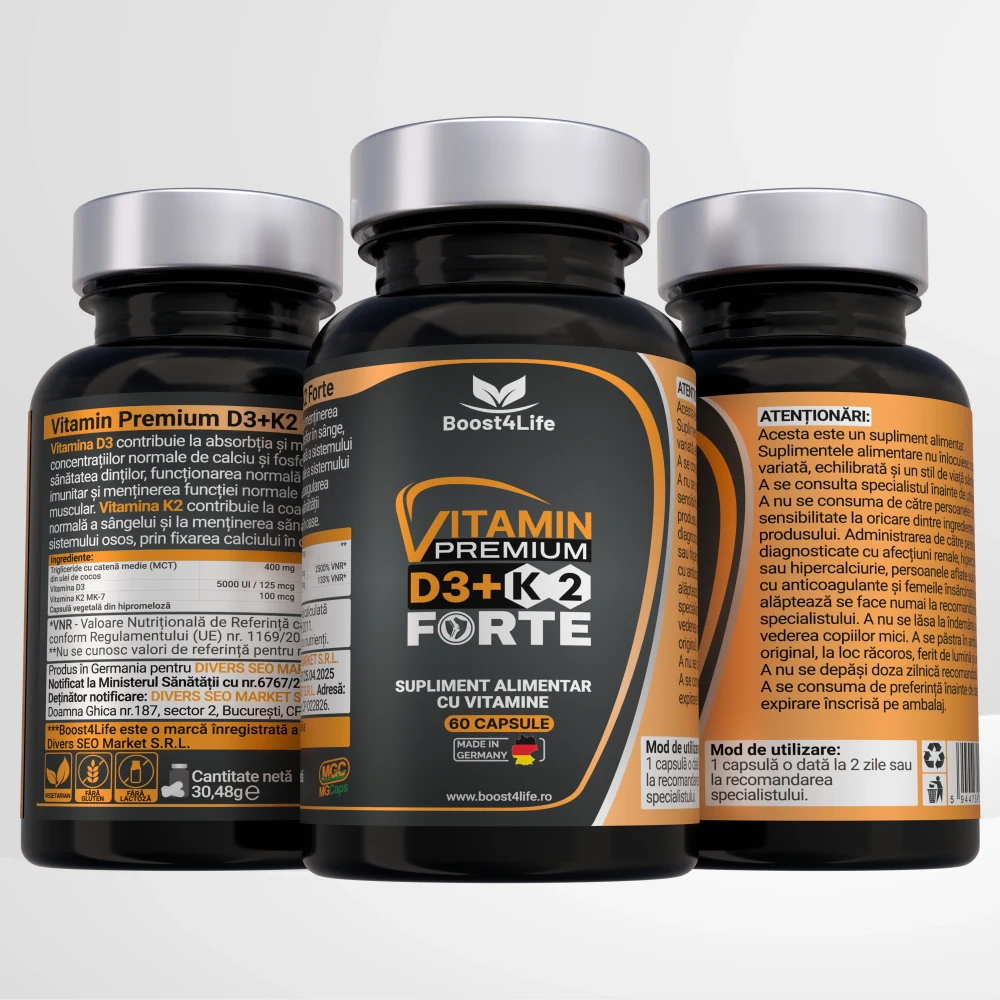 Vitamin Premium D3+K2 Forte de la Boost4Life este un supliment alimentar avansat, formulat pentru a susține sănătatea sistemului osos, muscular și imunitar. Cu o concentrație ridicată de vitamina D3 (5000 UI) și vitamina K2 MK-7 (100 mcg), acest produs oferă suport esențial pentru absorbția optimă a calciului și fixarea acestuia în oase. Formula este bazată pe trigliceride cu catenă medie (MCT) din ulei de cocos, care îmbunătățesc biodisponibilitatea, și este livrată în capsule vegetale MG Caps®, care conțin o formulă lichidă - o tehnologie inovatoare ce asigură puritate, stabilitate și eficiență maximă a ingredientelor.